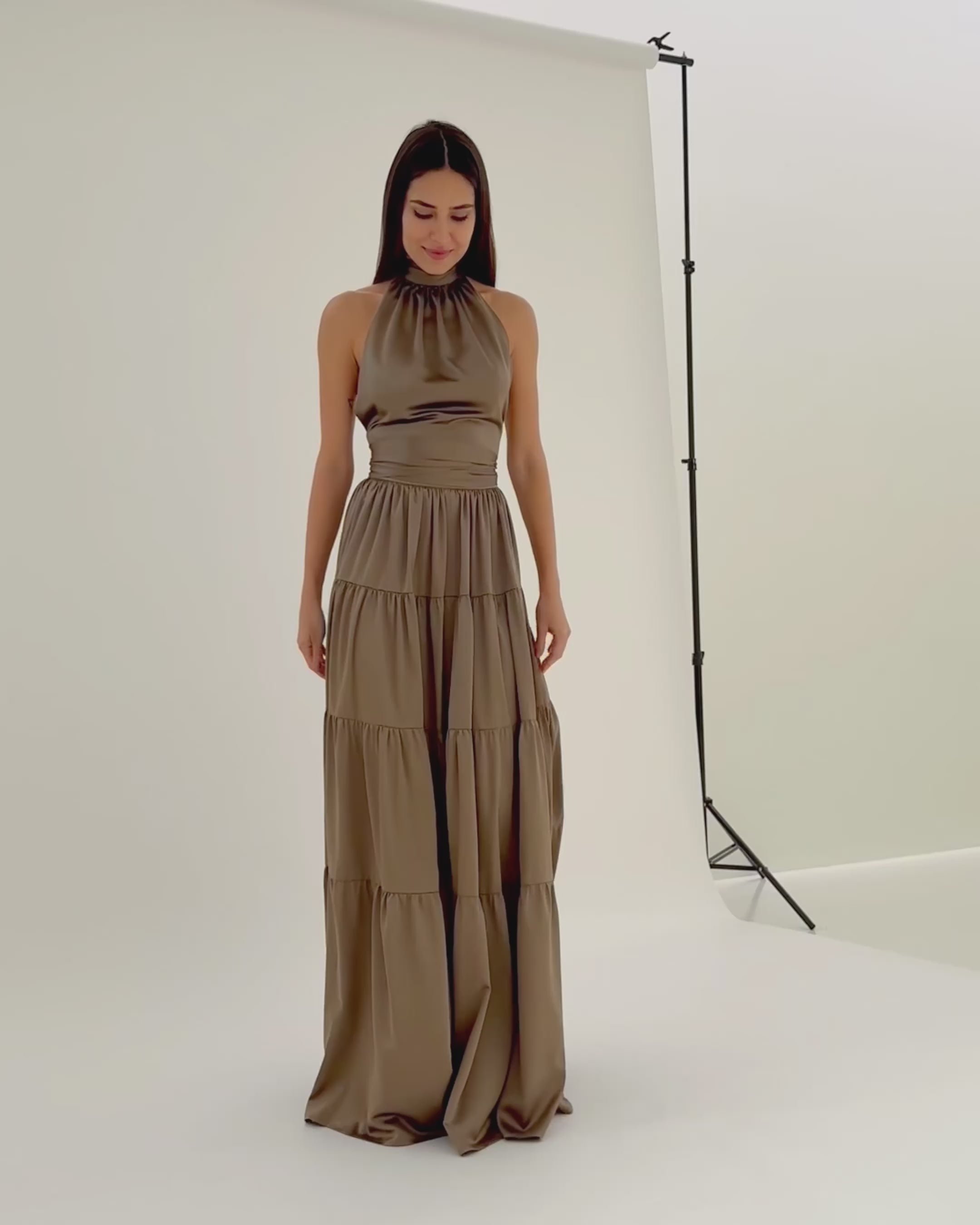 Boasting four layers of gathered satin-finish fabric that cascade with every step for an effortlessly beautiful flow.