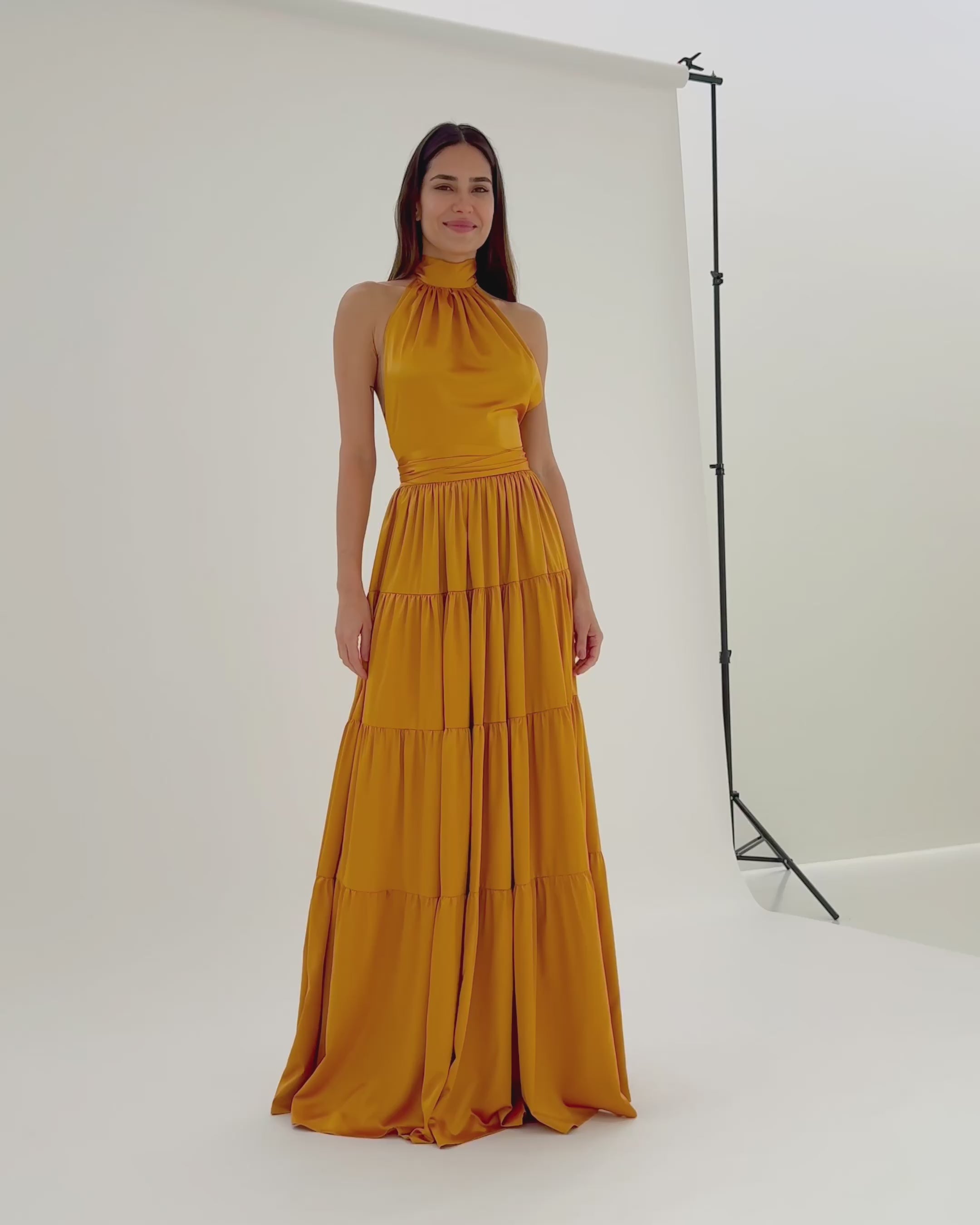 Boasting four layers of gathered satin-finish fabric that cascade with every step for an effortlessly beautiful flow.